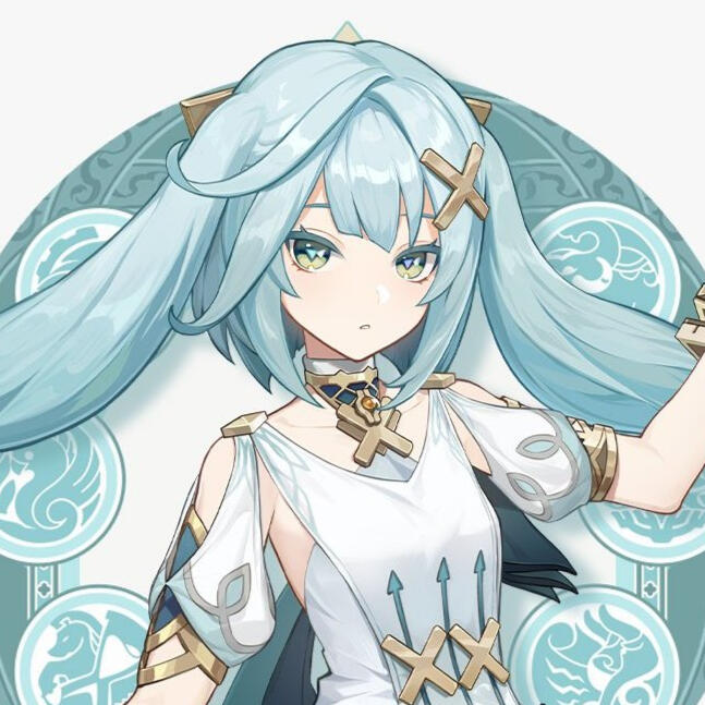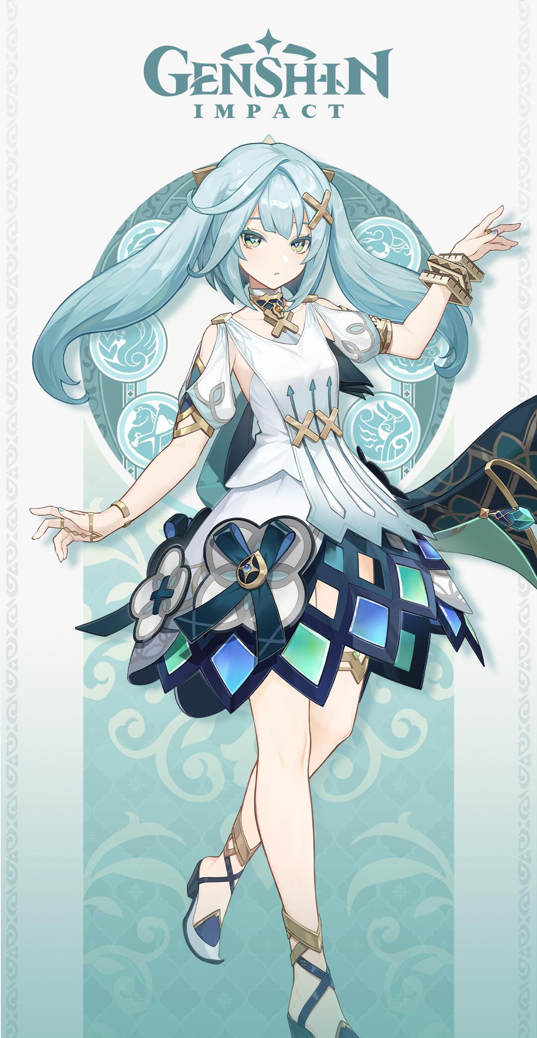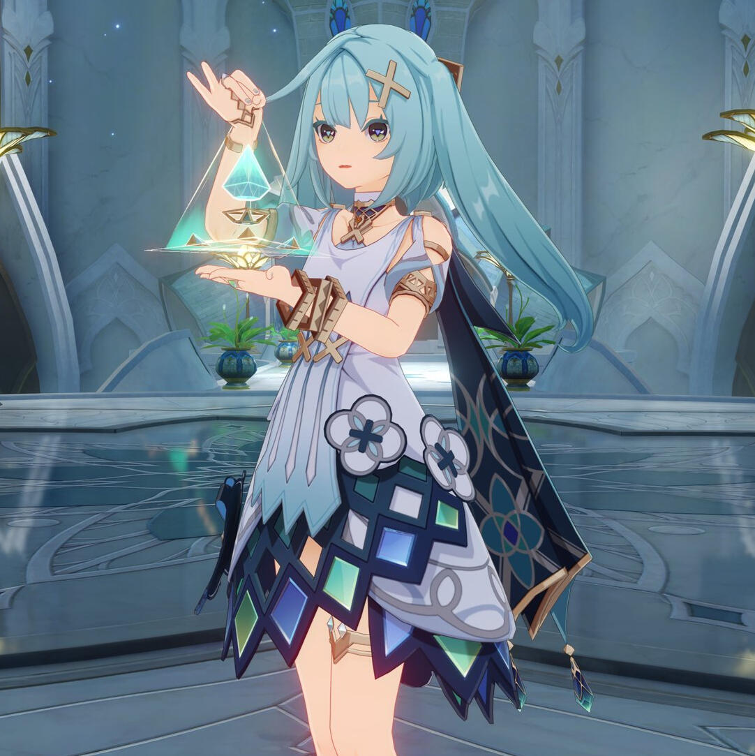 Faruzan is a petite young woman of fair skin. Her hair is a pale, icy blue, with messy bangs that frame the sides of her face with twin tails that curl slightly at the ends. Her eyes are a pale shade of blue and are partially golden. Her hair is styled with an x-shaped golden hairpin on the left side, and a pair of golden accessories that resemble cat ears.Faruzan wears a layered white dress with detached sleeves, decorated with numerous golden trinkets and gems, most notably around the neck and upper arms. She has a set of x-shaped trinkets pinned just above her skirt, which is decorated with some flower-shaped pieces held together by dark blue ribbons with a dark blue undercoat with a diagonal grid design, decorated at the hem with green and blue colored squares. Under this, she wears a gold trinket around her right thigh, and a pair of high heeled sandals. She wears a set of gold square-shaped bracelets on her left wrist along with a gold ring on her middle finger, and a number of chained jewelry around her wrist and right hand.